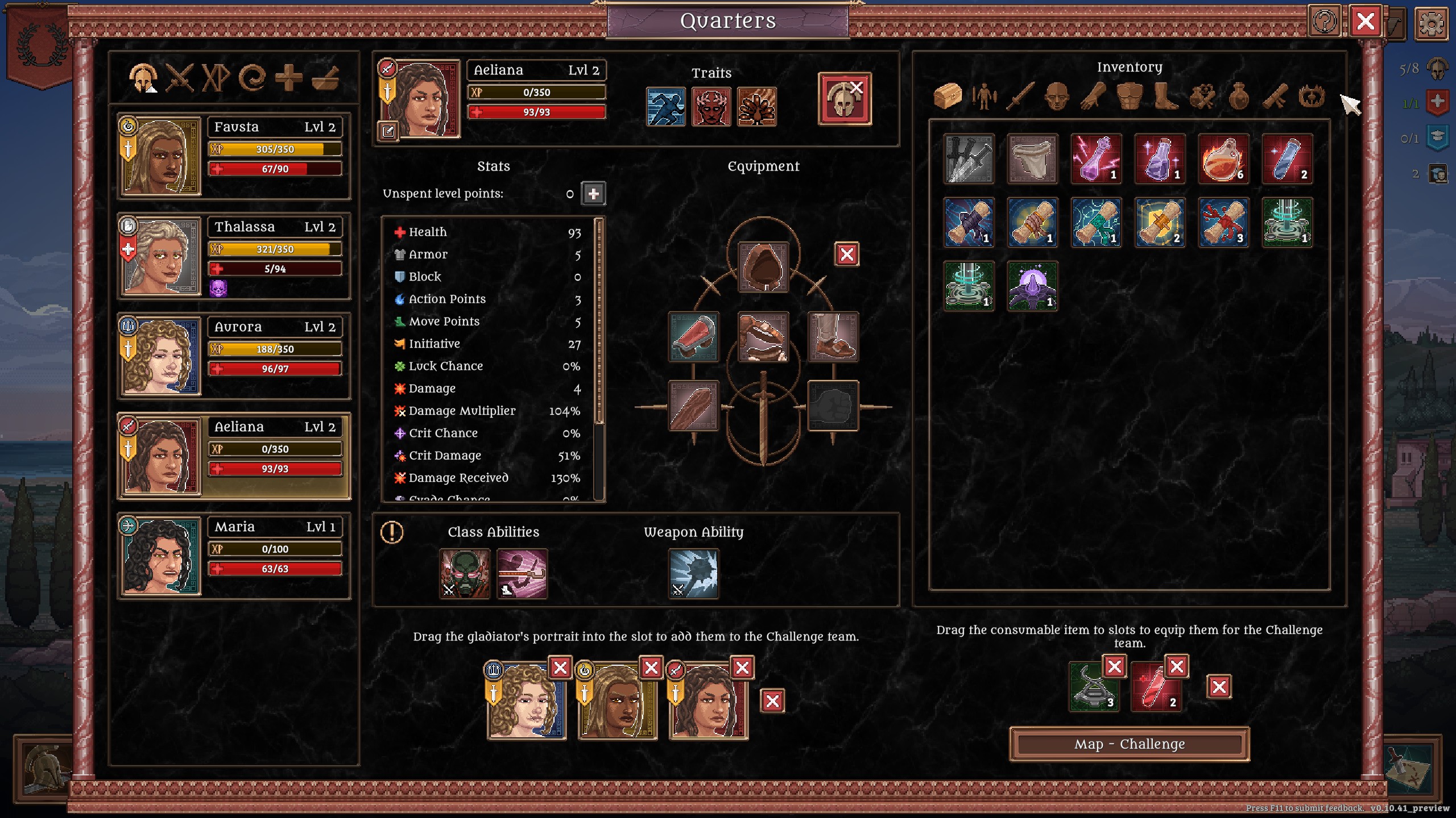 An important management element is the statuses (positive/negative effects) and traumas gladiators earn during fights, often forcing you to rest them or pay for quicker recovery. Thankfully, the game includes a speed-up option, but you’re still pushed to think tactically and outsmart your opponents. This is complicated by some frustrating RNG, like when an enemy with only a 5% evasion chance dodges multiple attacks in a row.