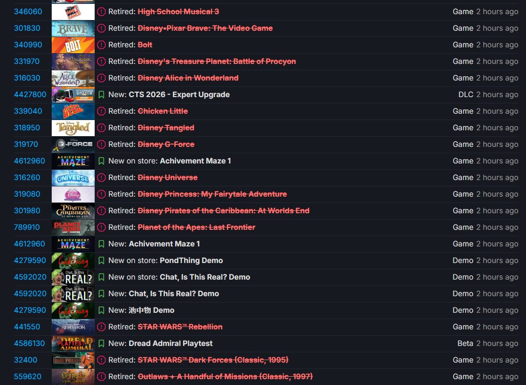 Among the removed games are family-oriented titles based on popular films such as Chicken Little, Bolt, and G-Force. Several games connected to the Star Wars franchise have also been pulled, including Star Wars Rebellion and Star Wars: Dark Forces.