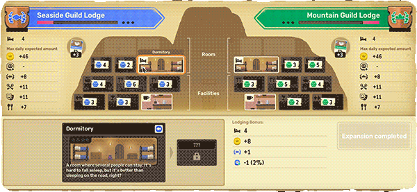 We hoped this mechanic would emphasize the “double game” theme and help players naturally understand the rules in the early stages. However, this only applies at the beginning. As players progress, intentionally provoking guild conflicts becomes an important part of their strategy for running a successful inn.