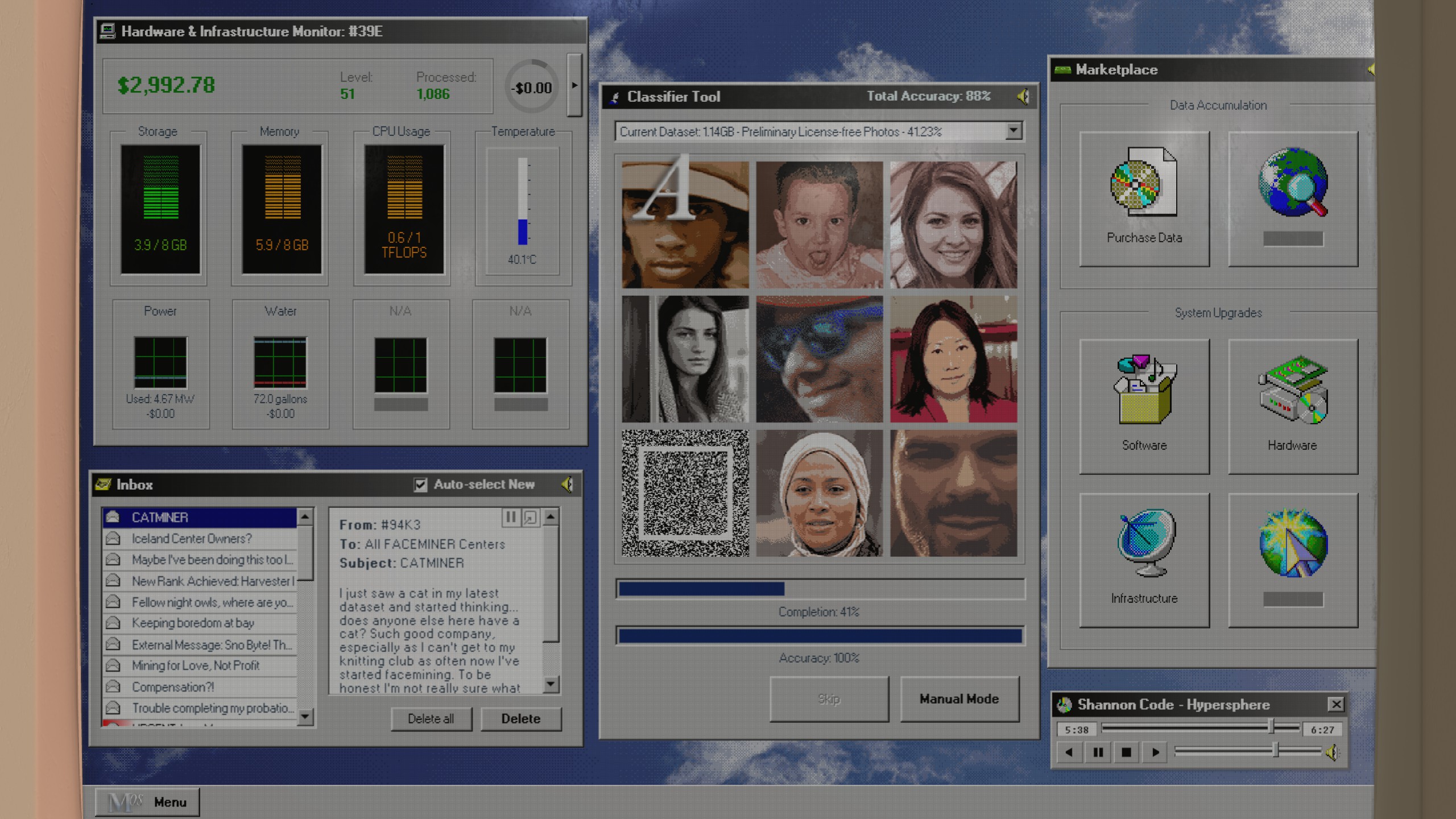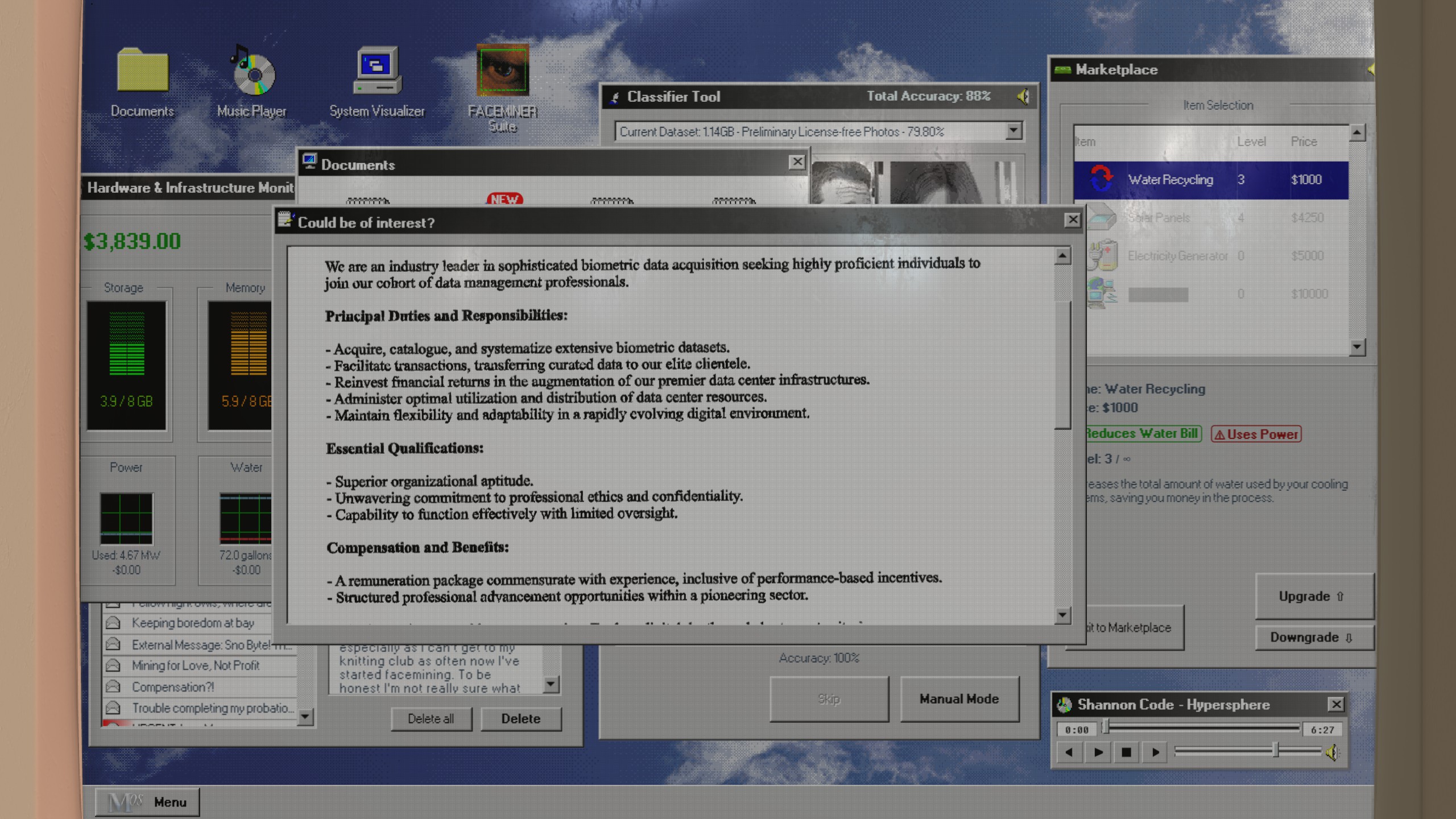 As you keep your data mining operations going, you’ll get occasional emails in your inbox. These come from supervisors, co-workers, and even outside groups like journalists and activists, all commenting on your work. As you complete more and more datasets, you’ll unlock different certification levels. These, in turn, unlock upgrades that you can pay for right out of your digital bank account.