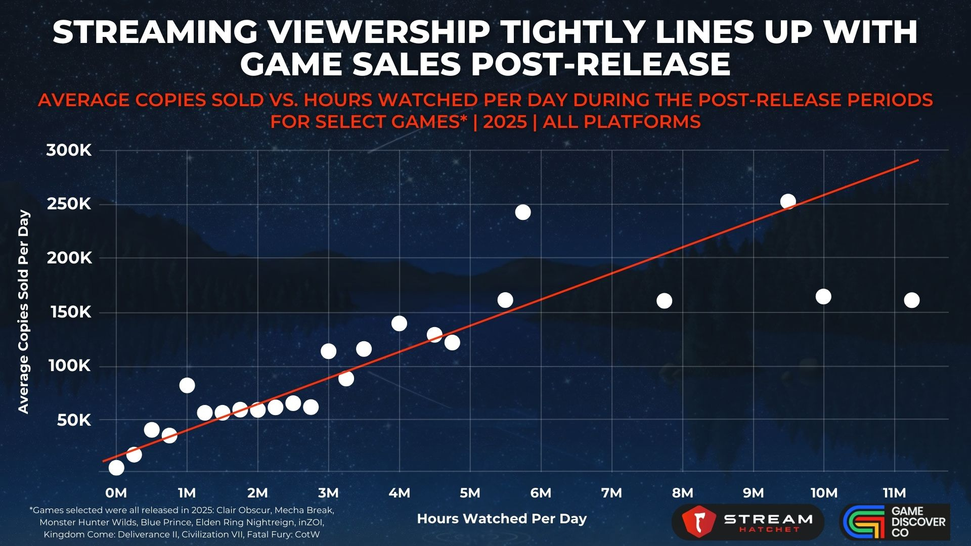 In a final analysis, the Stream Hatchet team mapped the “hours streamed per day” to “copies sold per day” for several 2025 releases. The resulting data showed a strong correlation across the board, leading to a fascinating statistic: for every 41 hours of post-release live-stream content watched, one copy of the game is sold on average.