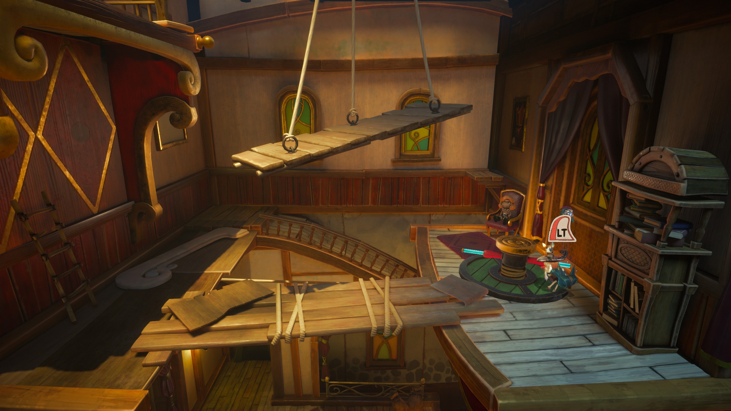 Once Upon a Puppet is a 2.5D puzzle-platformer set in a theatrical fantasy world. You control Nieve, a floating stagehand, and Drev, a wooden puppet, simultaneously bound by a magical thread. Using the controller’s left and right analog sticks, you navigate the Understage, jumping on different platforms, solving puzzles and exploring to confront a mad king and uncover the mystery of Stagefright.