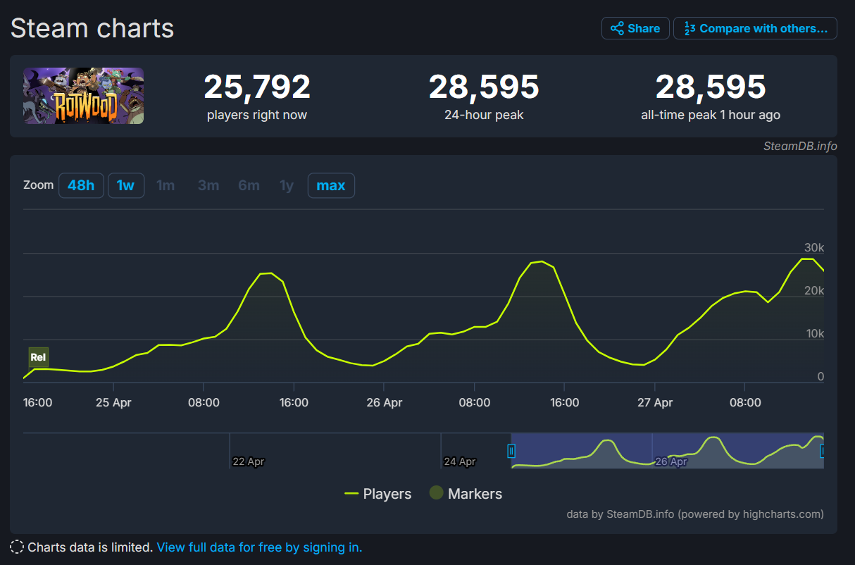Objavljen 24. travnja, Rotwood kombinira kut kamere karakterističan za Beat ’em up žanr i sustav borbe, u kojem se igrači bore protiv pokvarenih zvijeri koristeći različita oružja i vještine. U prva 24 sata od objave, igra je dosegnula vrhunac od 28,595 istodobnih igrača što je čini trećom najpopularnijom igrom u portfelju studija Klei Entertainment prema podacima sa SteamDB-a.