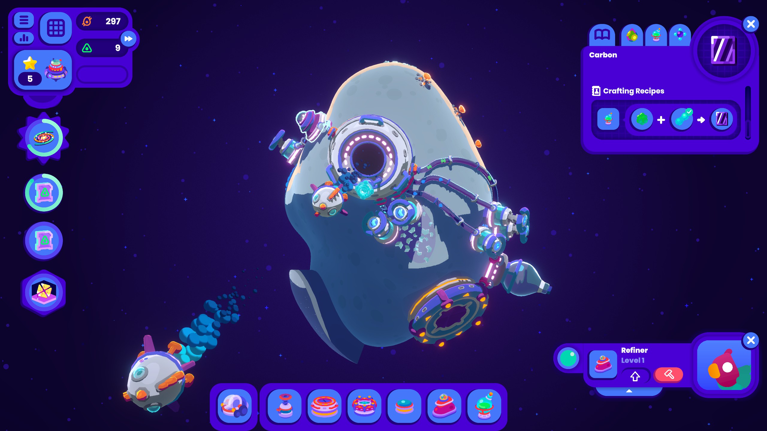 While complex games like Factorio might not be for everyone, Star Birds aims to make its gameplay more accessible. The core loop is simple: create automated production chains, with a helpful in-game wiki to guide you. You start on a small spherical asteroid with a few buildings, mining resources, and driving a small vehicle. Your main goal is to collect two types of in-game currency: one for building basic structures and another for researching new technologies and exploring new asteroids.