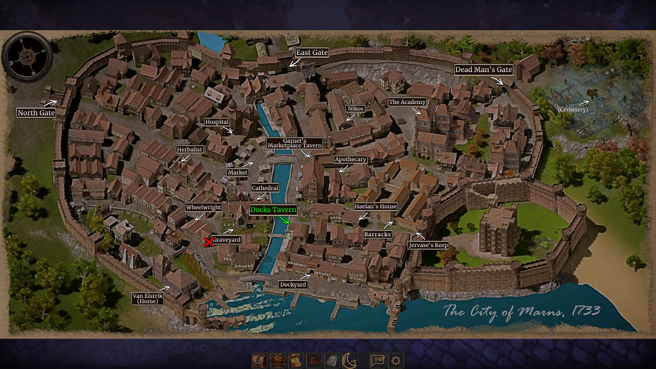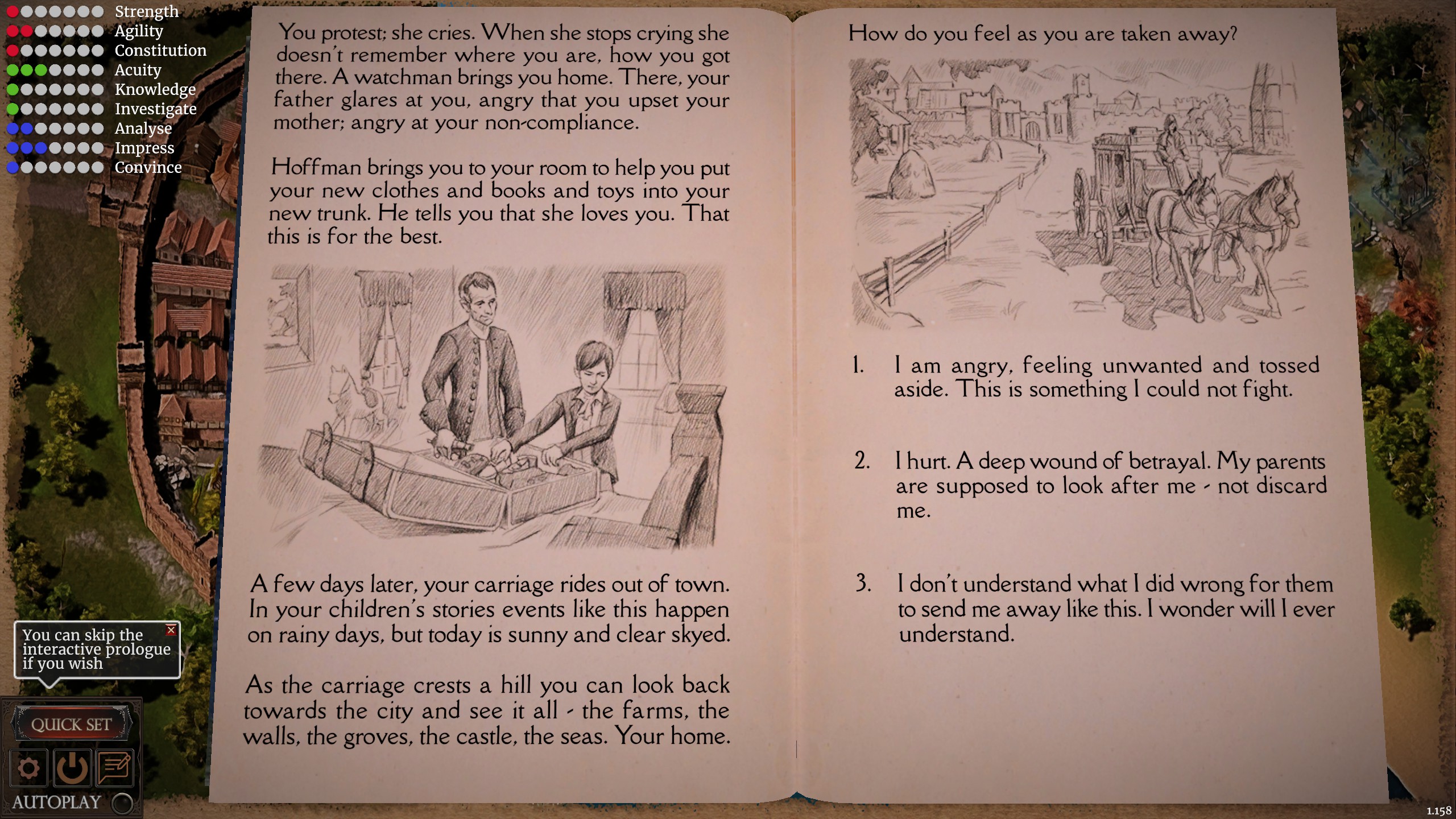 Early on, you pick one of three jobs: teacher, dock worker, or tavern server. Each job matches a skill type. You don’t have to pick a job that matches your skills, but it definitely makes things easier by giving you checks you’re more likely to pass without wasting those precious skill points.