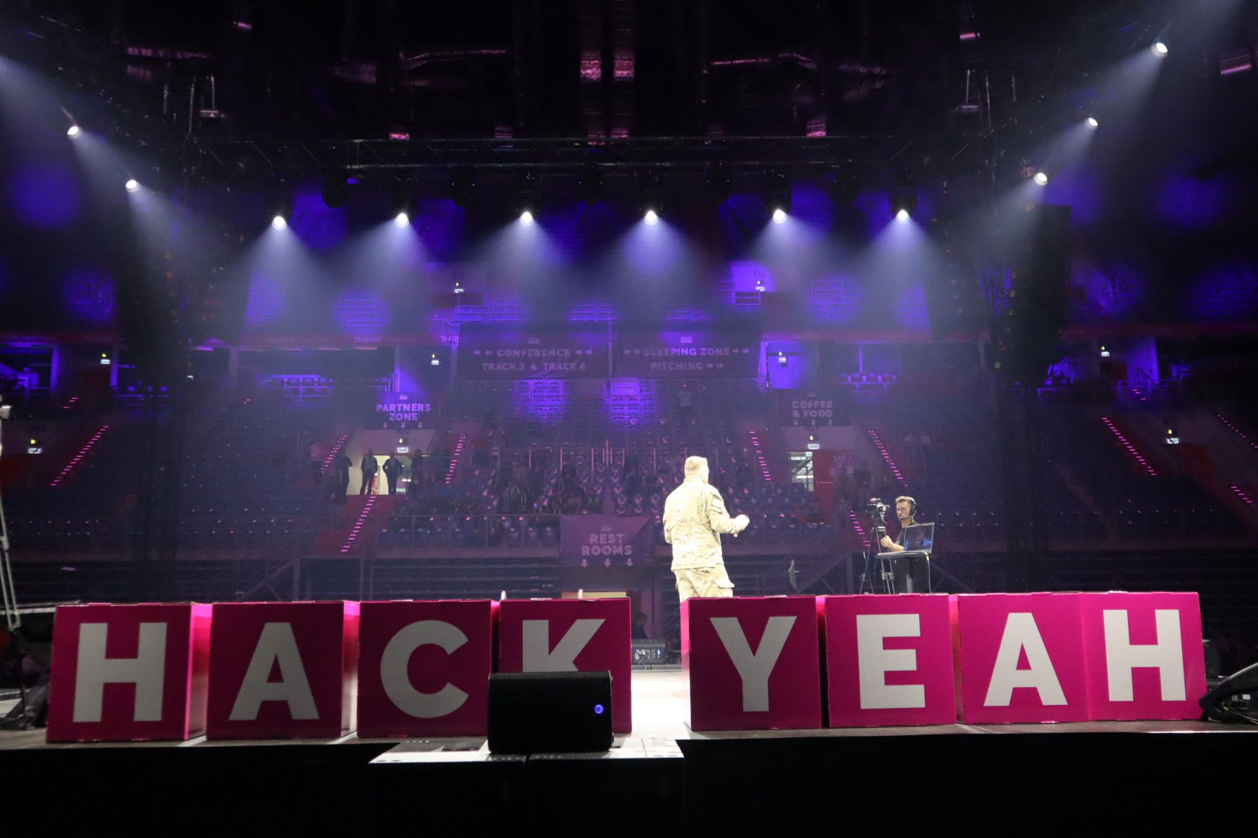 We managed to arrive in time for the official start of the event. After a brief welcome to the attendees and presentation of the hackathon plan, Colonel Jarosław Wacko took the floor on the main stage. His speech focused on issues related to national cybersecurity – he presented initiatives such as CTF, Locked Shields, and CyberLegion, among others.